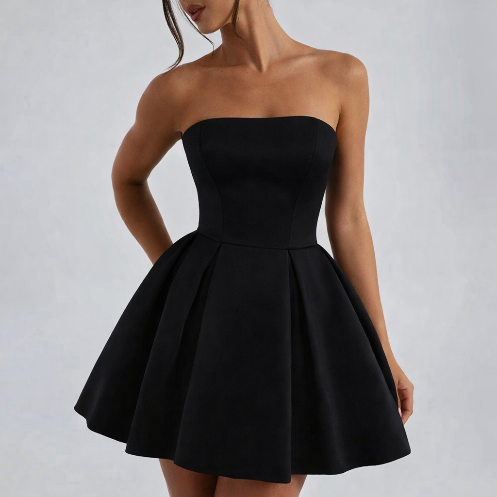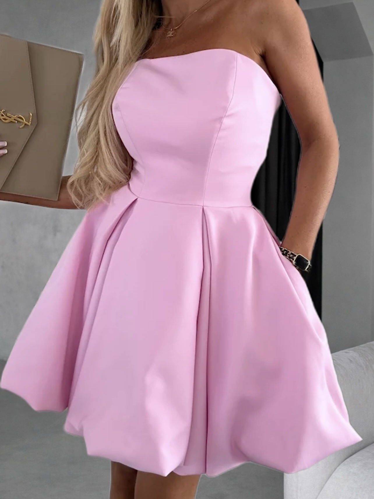 Model posiada gorsetową górę bez ramiączek, która pięknie eksponuje ramiona oraz linię dekoltu. Dopasowana talia modeluje sylwetkę, a rozkloszowany dół w formie modnej „bombki” nadaje sukience lekkości i dziewczęcego charakteru.