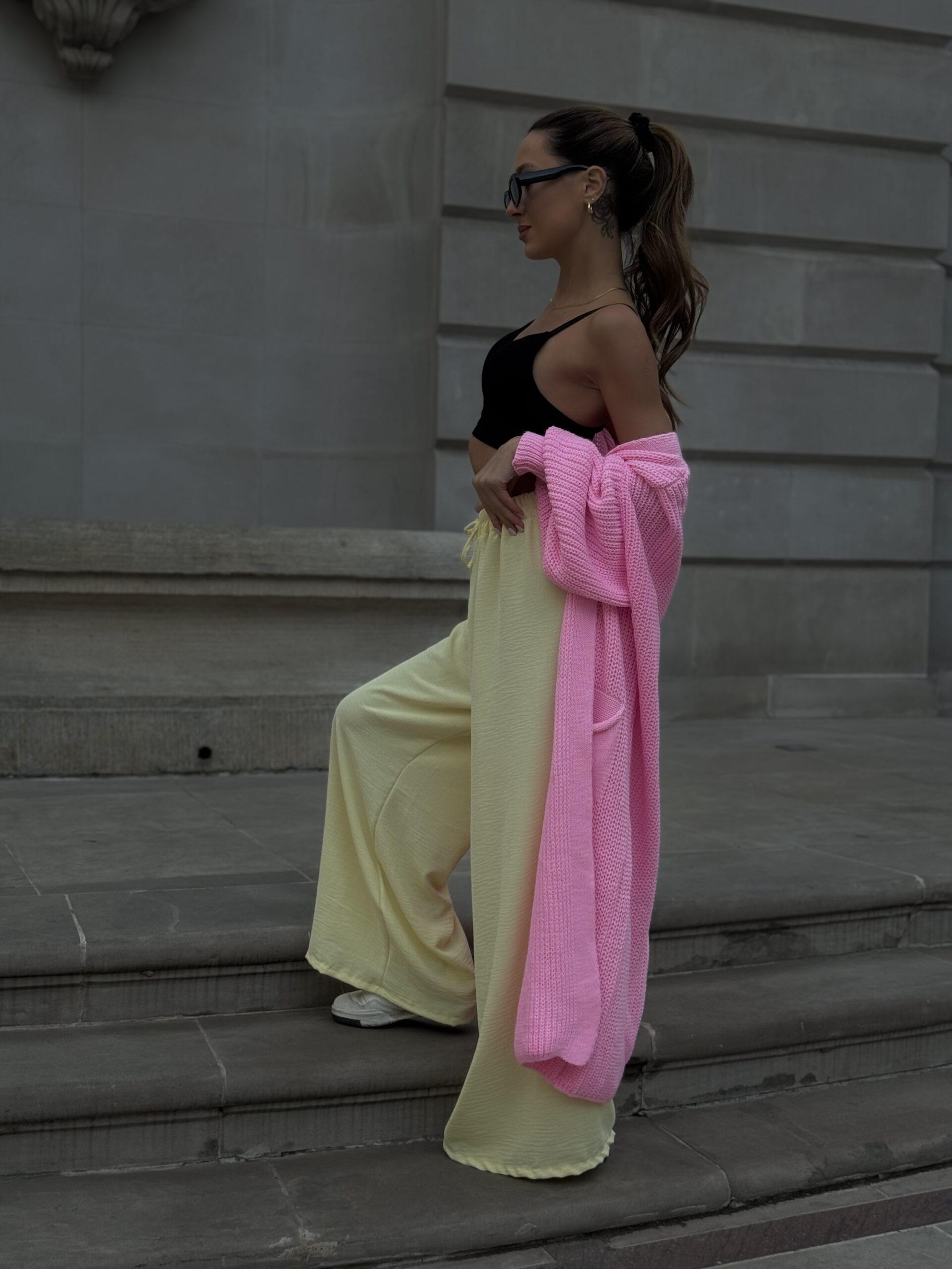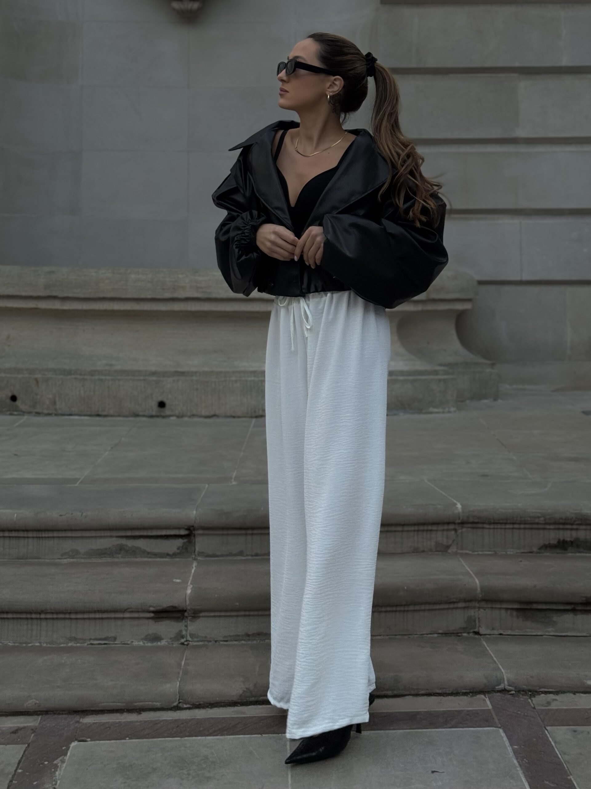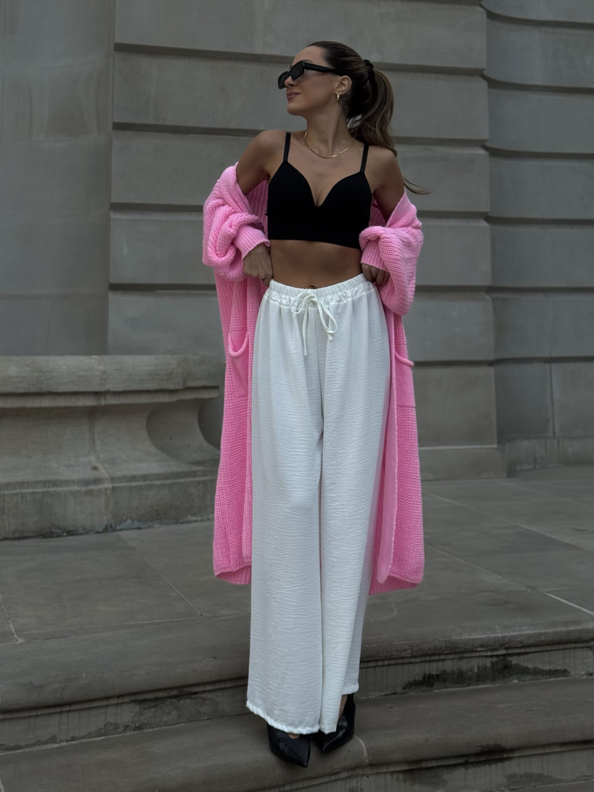 Luźny fason pięknie układa się na sylwetce, zapewniając swobodę ruchów i komfort noszenia przez cały dzień. Elastyczna talia z regulowanym wiązaniem pozwala idealnie dopasować spodnie do figury, jednocześnie podkreślając jej proporcje.