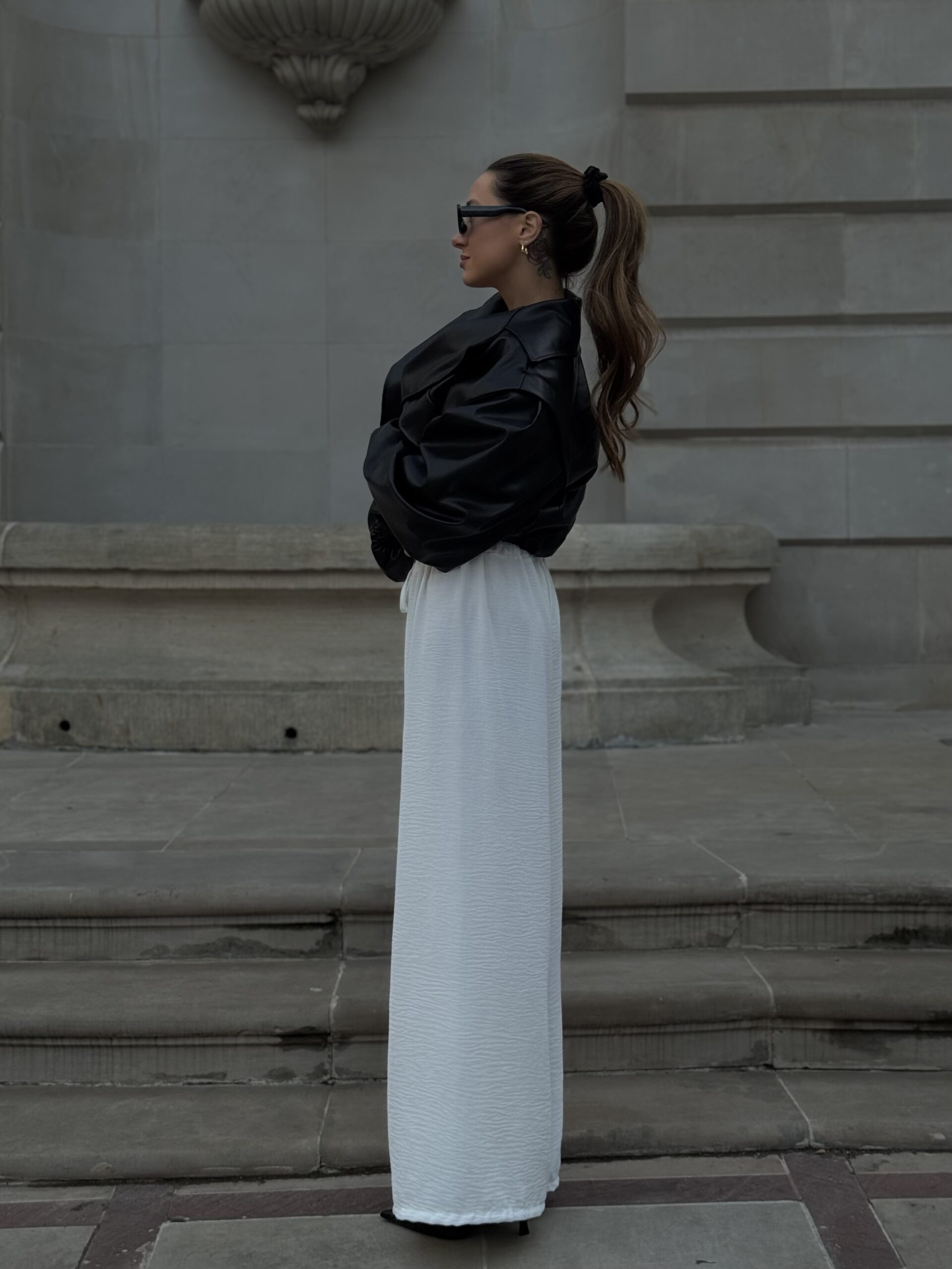 Stylowe spodnie materiałowe o szerokiej nogawce, które łączą wygodę z nowoczesnym, minimalistycznym designem. To uniwersalny model, który sprawdzi się zarówno w codziennych stylizacjach, jak i bardziej dopracowanych zestawach.
