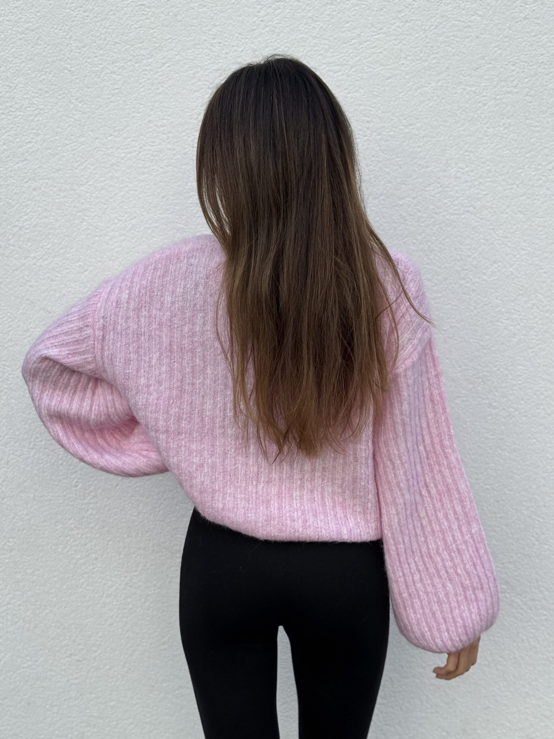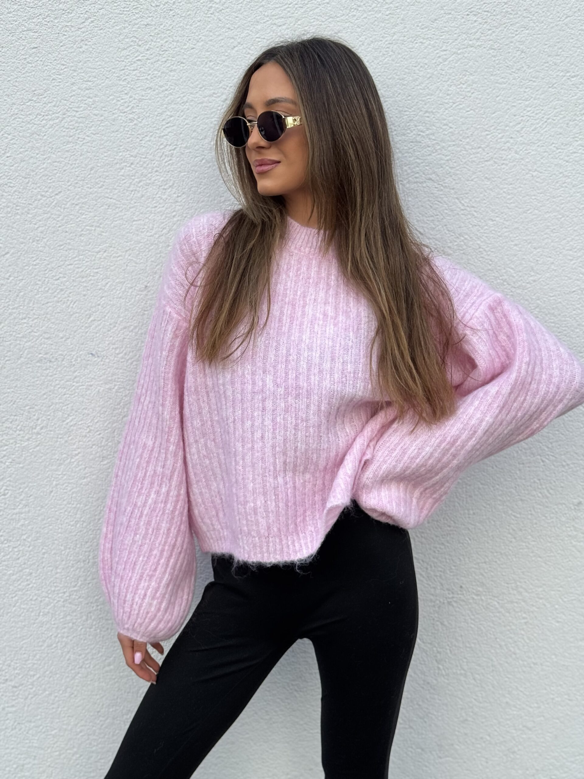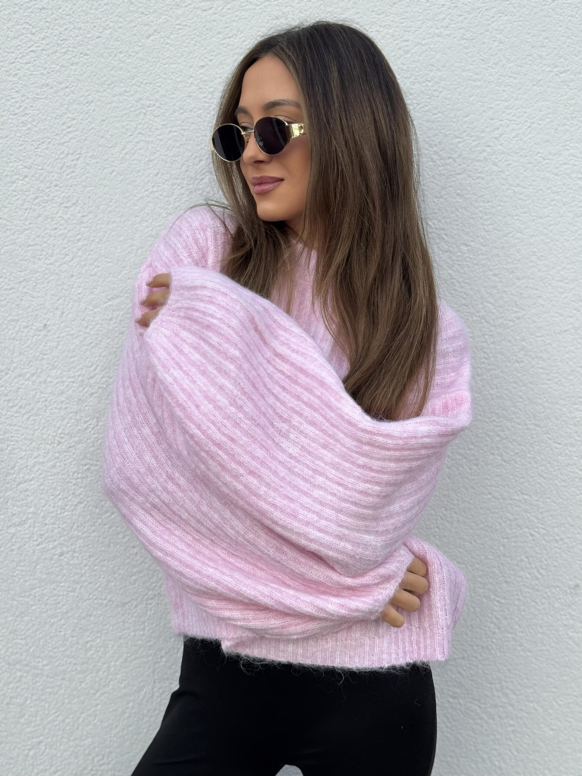 Stylowy i niezwykle miękki sweter w delikatnym, pudrowo-różowym odcieniu, który zachwyca swoją subtelną kolorystyką oraz wyjątkowo przyjemną w dotyku fakturą. Lekko puszysty materiał nadaje mu lekkości i sprawia, że wygląda niezwykle kobieco i elegancko.
