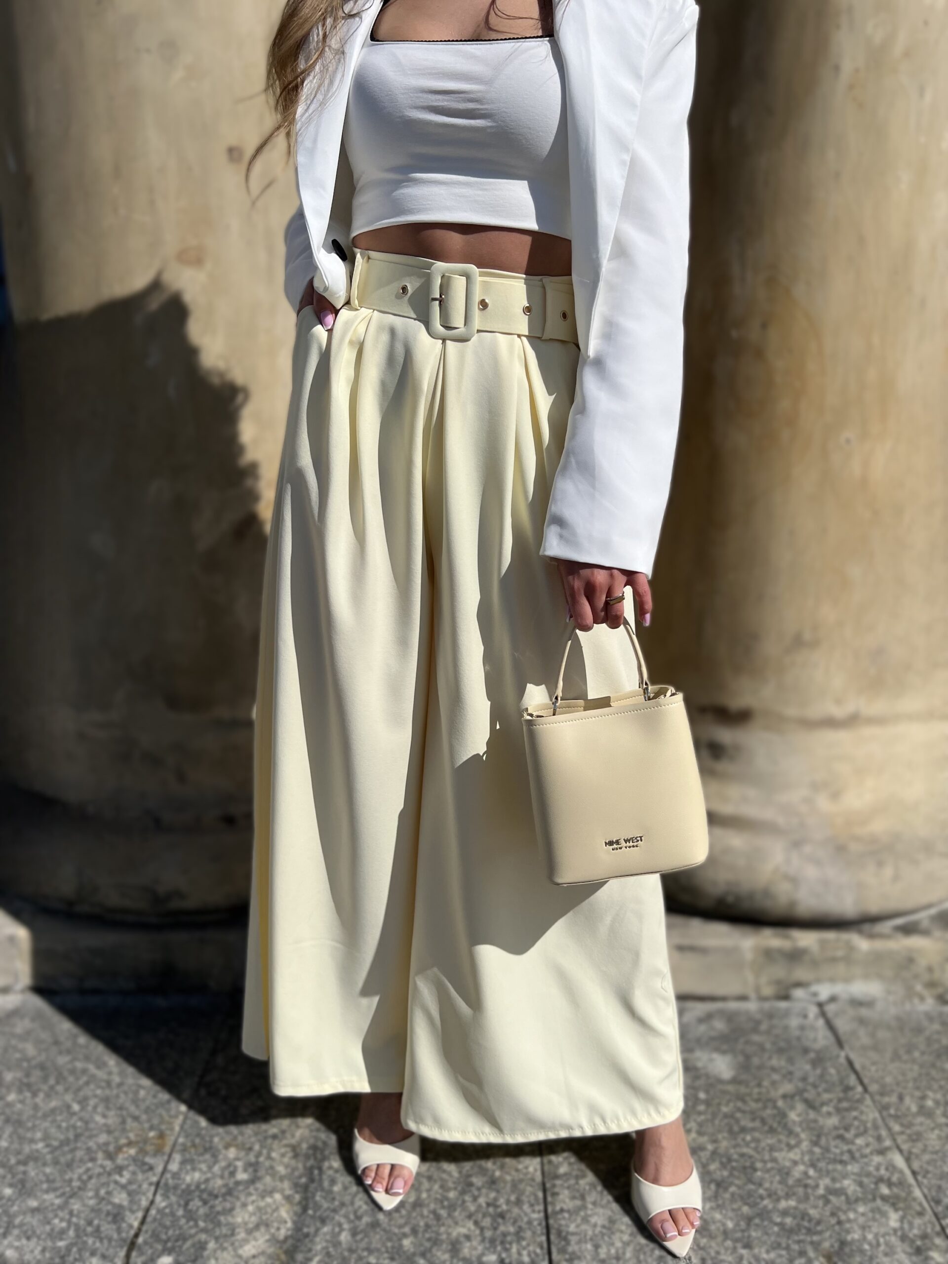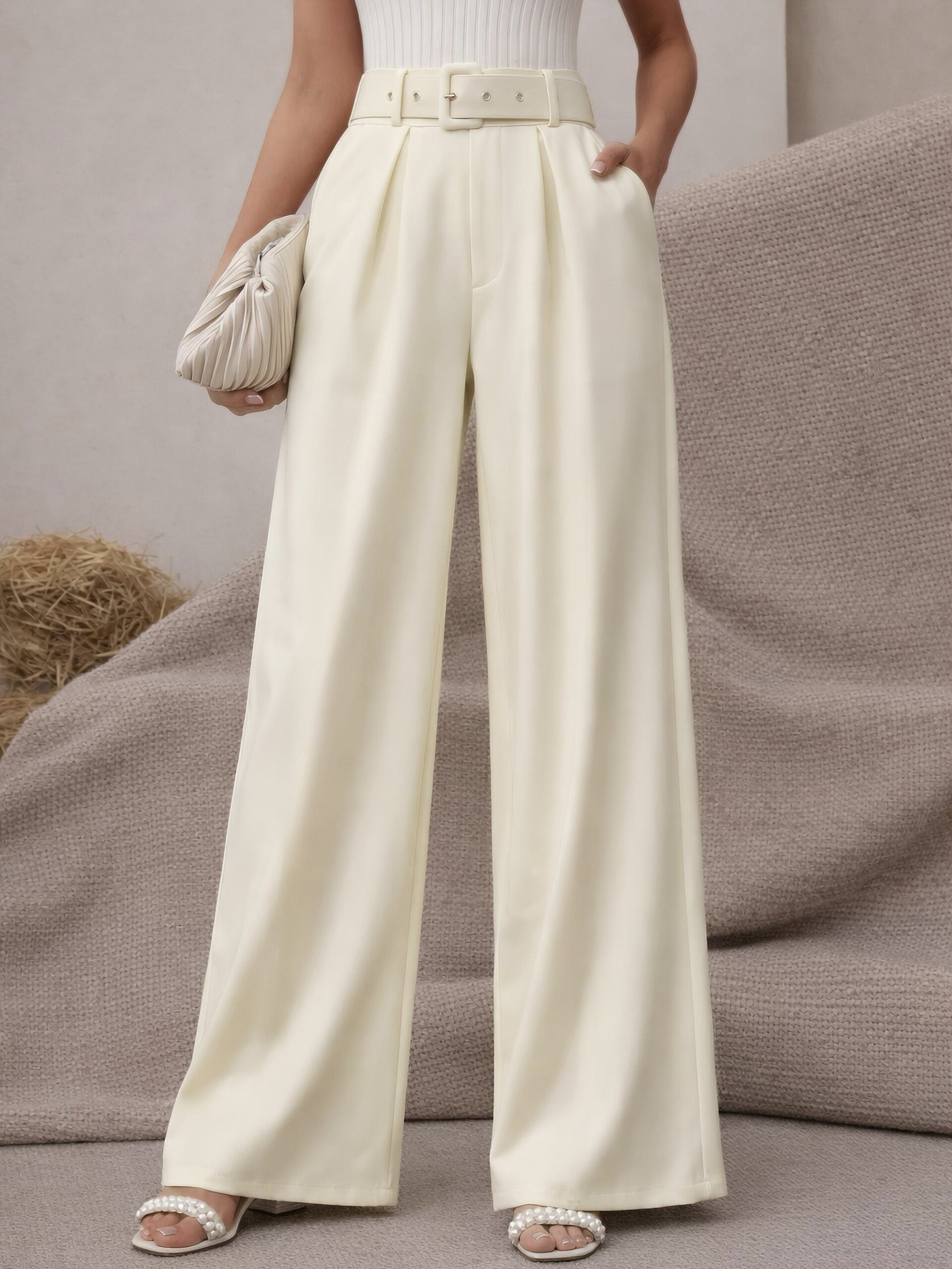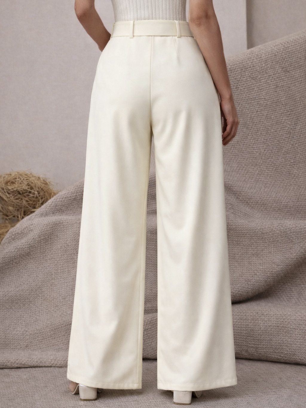 Model z wysokim stanem i szerokimi nogawkami optycznie wydłuża nogi, a pasek z klamrą pięknie podkreśla talię.