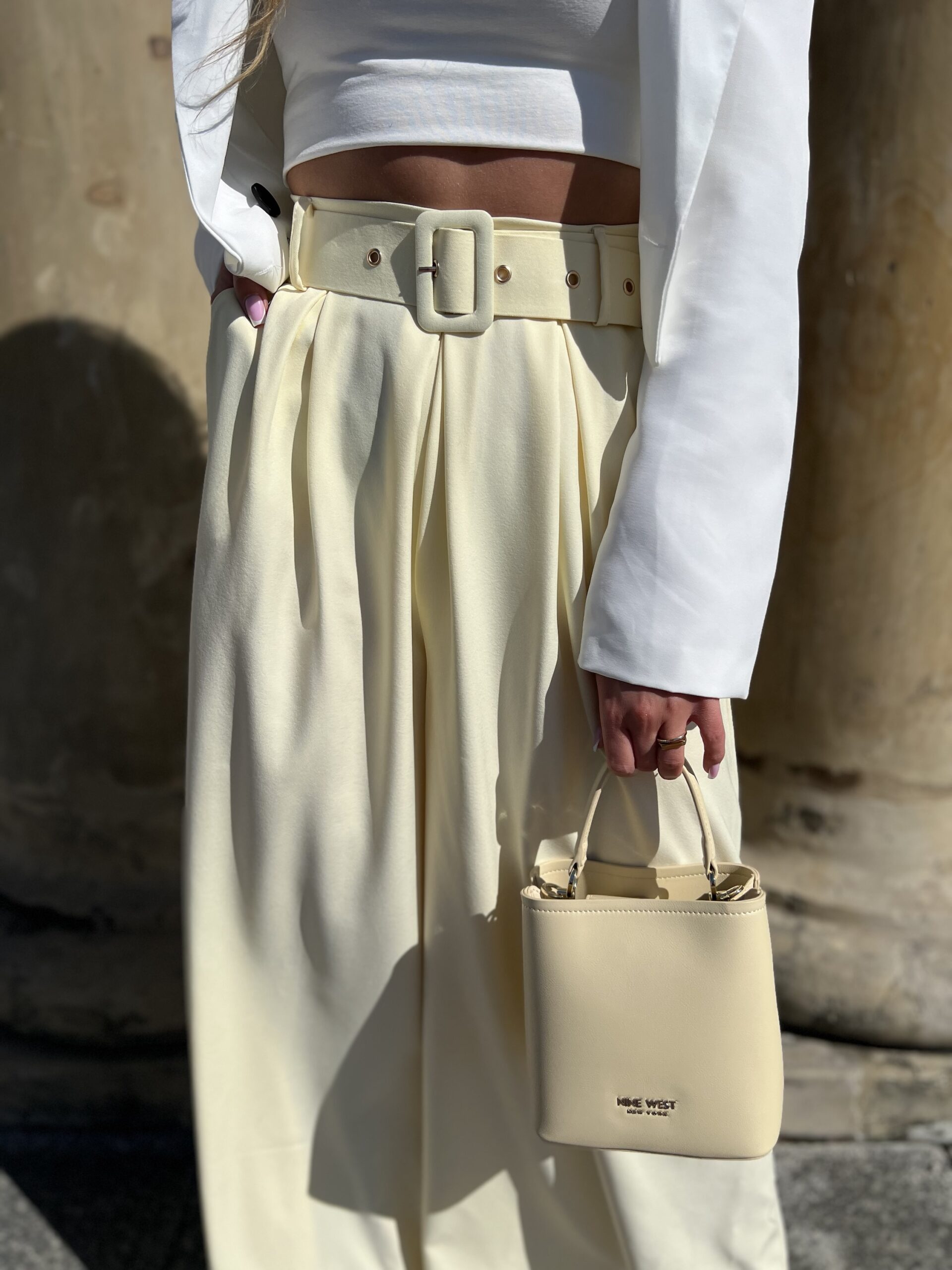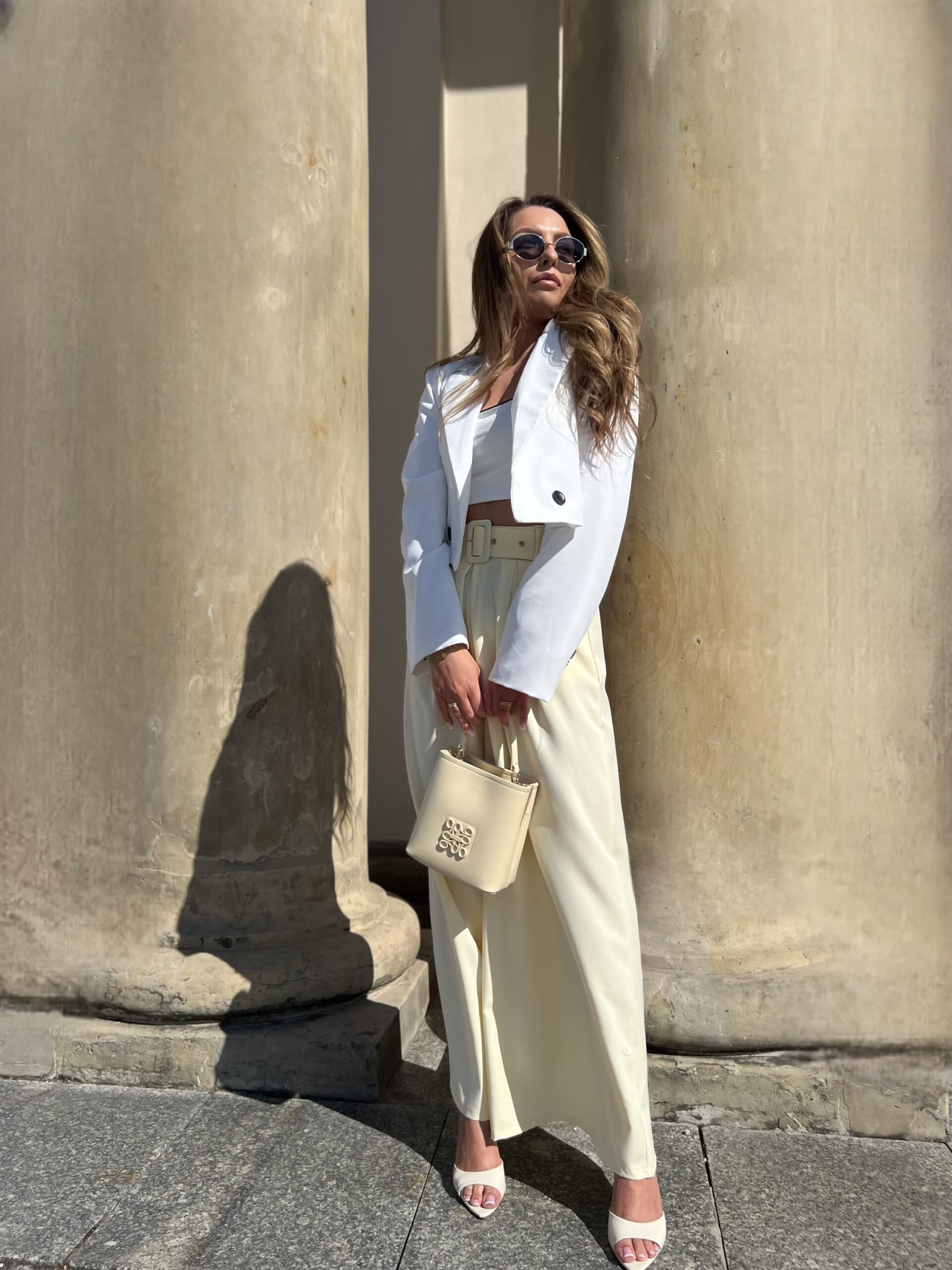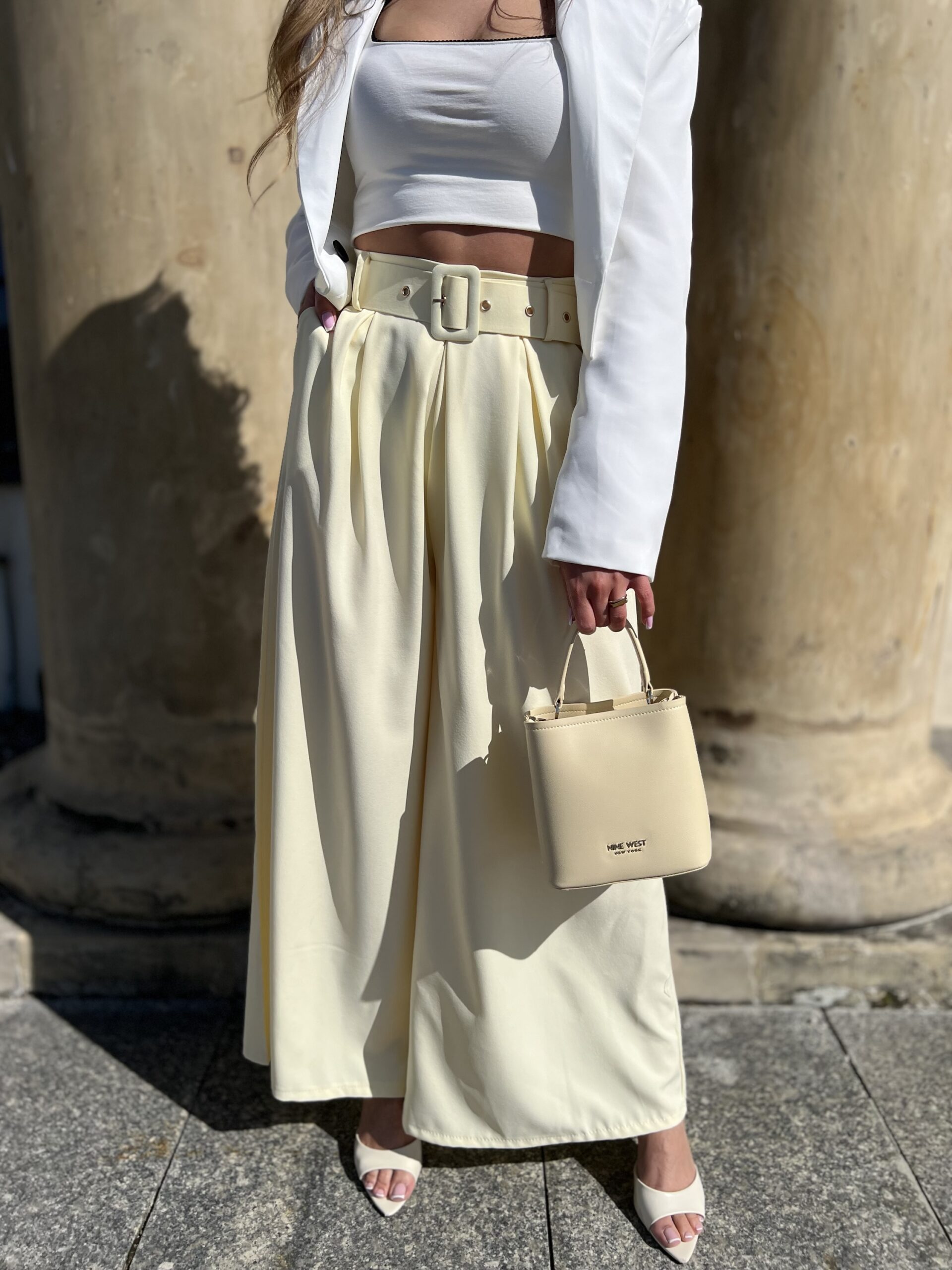 Model z wysokim stanem i szerokimi nogawkami optycznie wydłuża nogi, a pasek z klamrą pięknie podkreśla talię.
