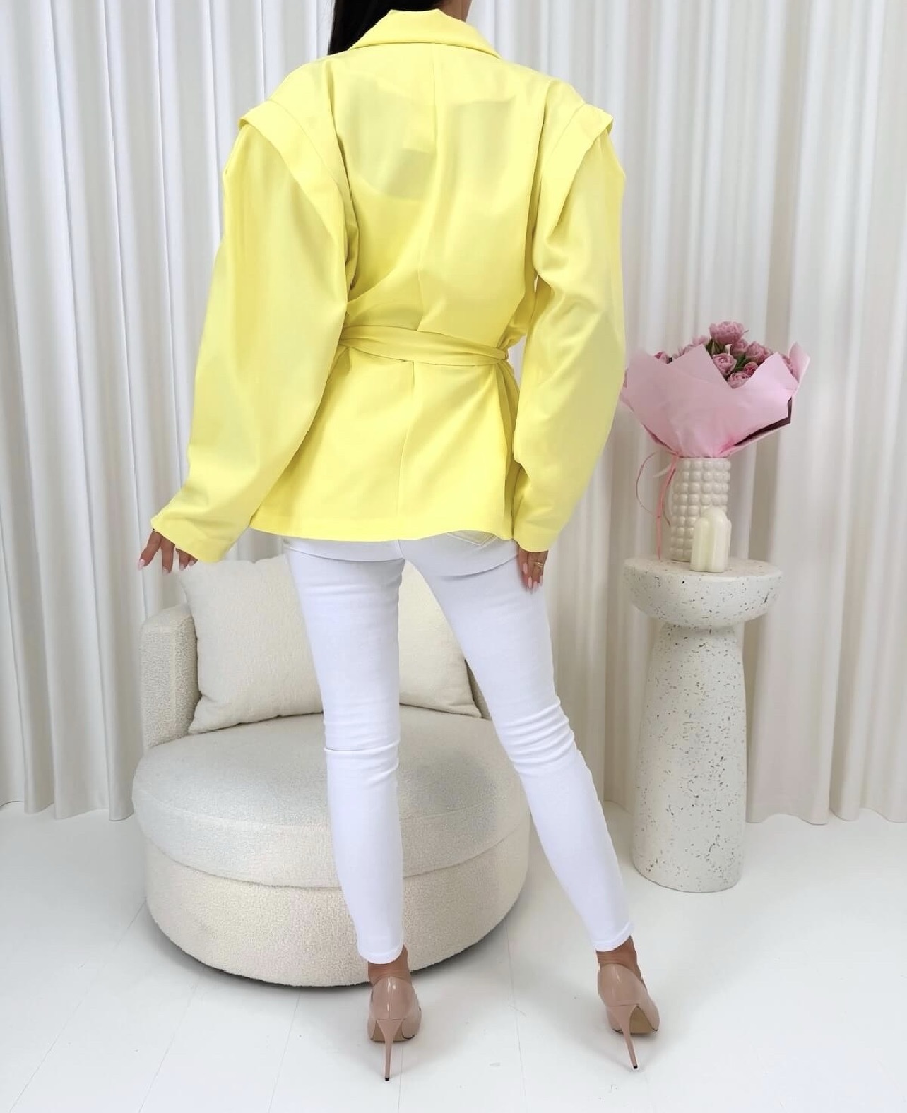 Stylowa marynarka w pastelowym odcieniu żółci, która dodaje świeżości każdej stylizacji. Model z poduszkami na ramionach pięknie podkreśla sylwetkę, a wiązanie w talii nadaje kobiecego charakteru.